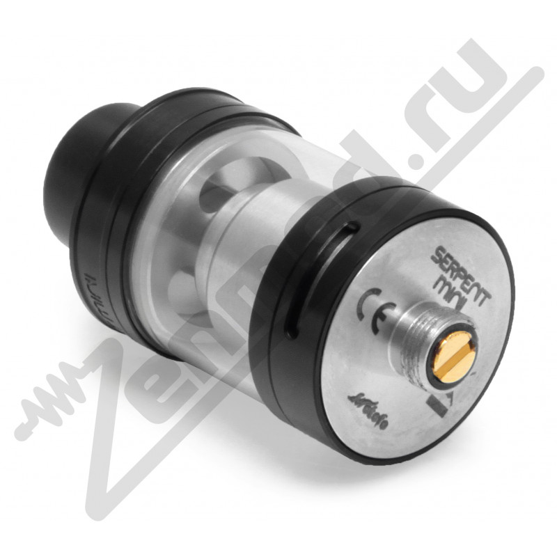 Бак Serpent Mini от компании Wotofo. Serpent имел хороший успех среди вэйперов, несмотря на то, что заточен только под одну спираль. В следствии этого Wotofo представляют нам Serpent Mini, обслуживаемый бак на одну спираль, но гораздо более компактных размеров. База у бака двухстоечная. Как таковых отверстий для спиралей он не имеет, вместо этого сделаны прорези, в которые кладется конец койла и зажимается винтом. Такое решение превращает обслуживание бака в легкое и простое занятие. Но помимо этого подразумевается установка больших и мощных койлов, благо обдув это позволяет. Отверстие обдува диаметром 4 мм позволит справиться со всеми возможными намотками. Поток воздуха плавно регулируется кольцом внизу бака. Заправка осуществляется сверху, после откручивания крышки. 510 коннектор регулируемый.